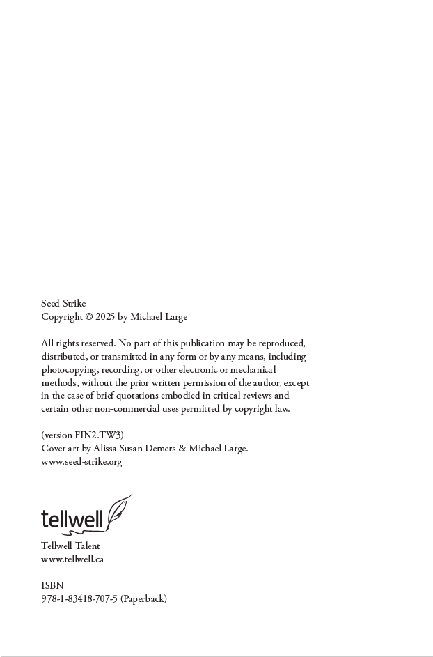 "Seed Strike", the book, is available in its entirety from Indigo, Amazon, Barnes & Noble, and other online book sellers. On "Seed Strike", the website, you can preview the book by reading key parts of it.