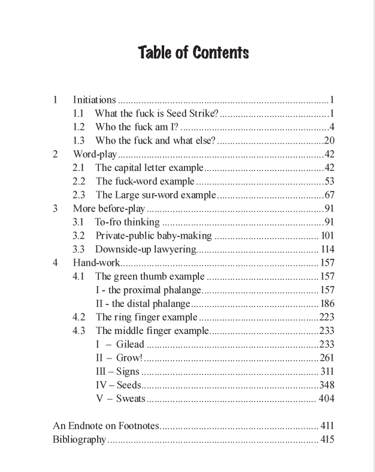 "Seed Strike", the book, is available in its entirety from Indigo, Amazon, Barnes & Noble, and other online book sellers. On "Seed Strike", the website, you can preview the book by reading key parts of it.